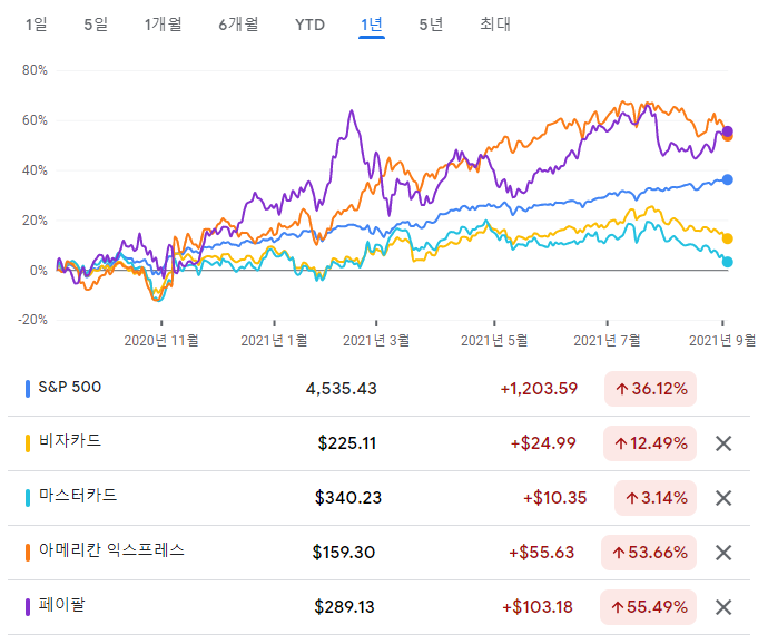 아메리칸 익스프레스와 페이팔의 수익률이 높습니다. 단, 페이팔은 변동성이 큽니다.