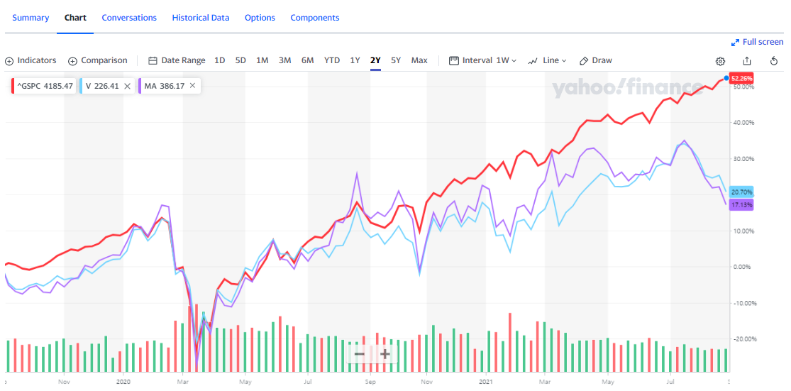 2년 흐름입니다. 빨간색은 S&P 500, 하늘색은 비자카드(V), 보라색은 마스터카드(MA)입니다. 비자와 마스터 모두 S&P 500보다 좋았던 구간도 있습니다. 그런데 최근 흐름이 안 좋습니다.