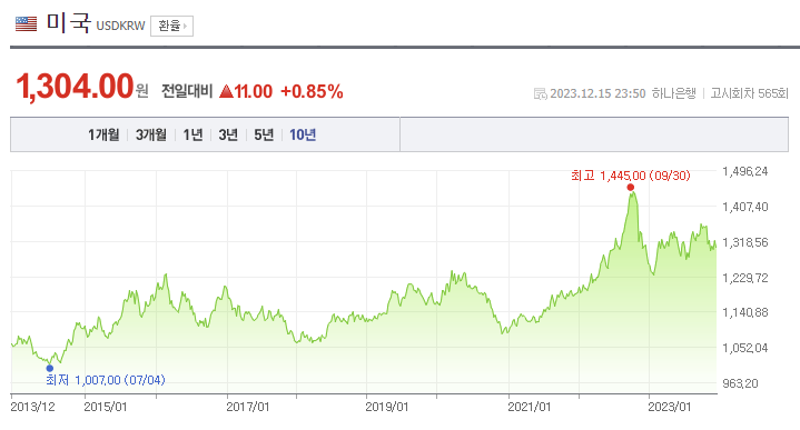 아래는 10년의 환율 흐름인데 1,300원은 과거 1,000원에 비하면 높죠~