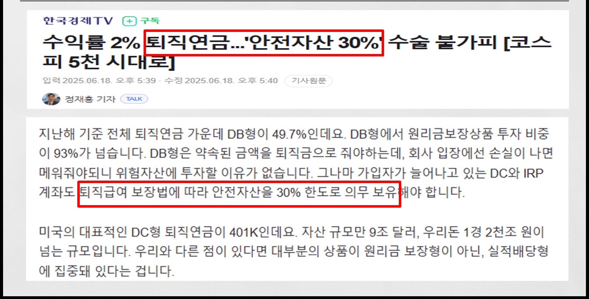 퇴직급여 보장법에 따라 안전자산으로 분류된 자산을 의무로 30%이상 보유해야 합니다.