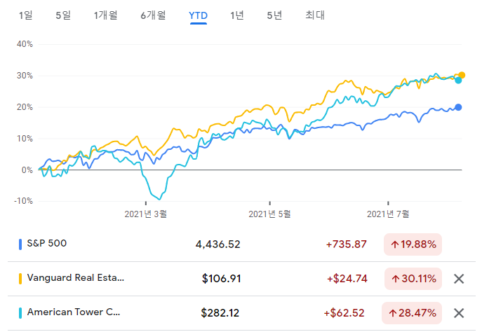 S&P500는 파란색, VNQ는 노란색, AMT는 하늘색입니다.