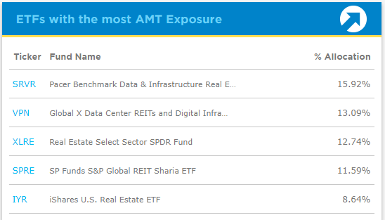 ETFs with the most AMT Exposure 부분에서 비중이 큰 ETF 5개가 나타납니다.