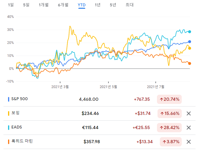 S&P500와 보잉, 에어버스, 록히드마틴의 올해 수익률을 비교해보았습니다.