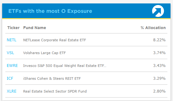 ETFs with the most O Exposure 부분에서 비중이 큰 ETF 5개가 나타납니다.