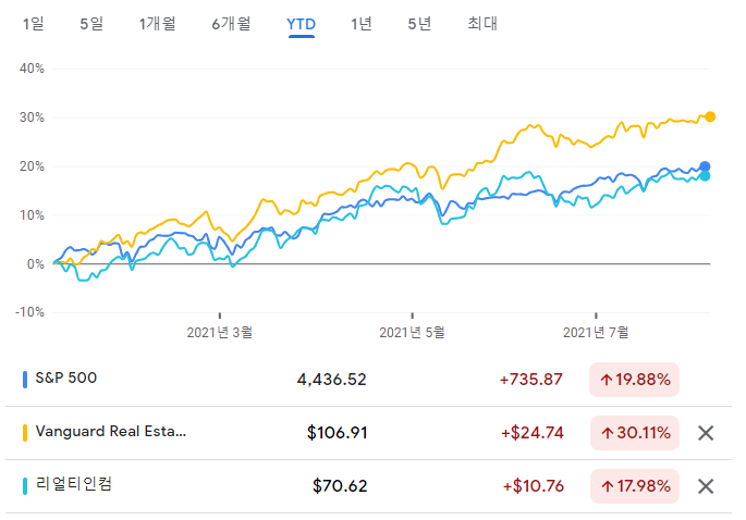 S&P500는 파란색, VNQ는 노란색, O는 하늘색입니다.