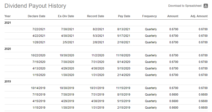 2021년 2월 16일, 2020년 11월 16일, 2020년 8월 14일, 2020년 5월 15일, 2020년 2월 14일, 2019년 11월 15일 모두 1주당 0.67달러(세전) 지급되었습니다.