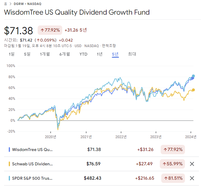 DGRW의 1년 수익률은 15.71%, 5년 수익률은 77.92%입니다.