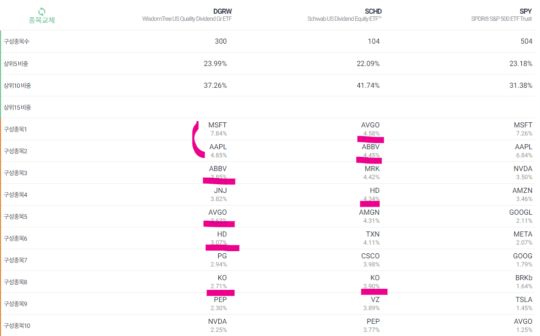 DGRW는 배당률은 낮지만 MSFT(마이크로소프트), AAPL(애플), NVDA(엔비디아) 등 주요 테크 기업들을 보유하고 있습니다. SCHD를 보니 상위10비중 종목 중 4개의 종목이 DGRW와 같습니다. 비중은 다르고요~