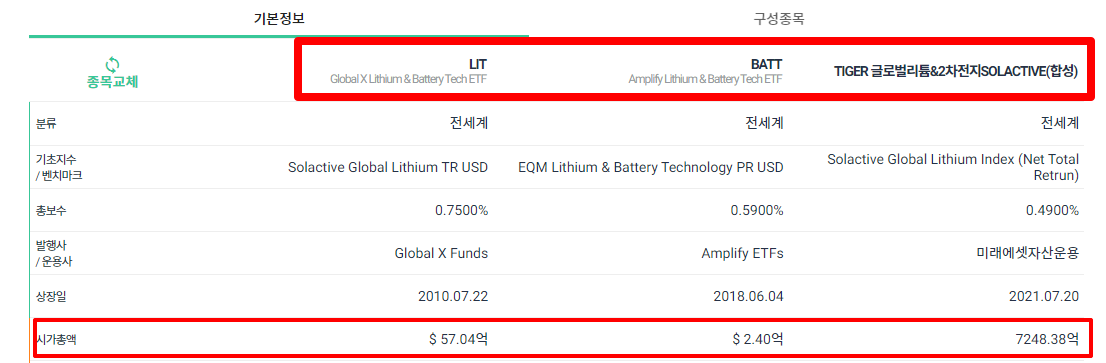 미국 시장에 상장된 LIT, BATT 그리고 국내 시장에 상장된 TIGER 글로벌 리튬&2차 전지 ETF입니다.