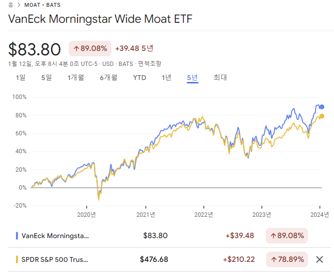 MOAT는 지난 5년 동안 89.08%의 수익률을 보였습니다. 이는 동기간 S&P 500 지수(SPY)의 78.89% 수익률을 상회하는 것으로, MOAT가 이 기간 동안 더 높은 수익률을 제공했음을 나타냅니다.