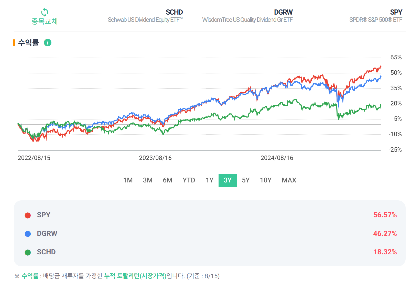 연간 배당률로 보면, 그리고 2022년의 방어력을 보면, SCHD는 매력이 있는데, 최근 흐름이 참 손이 안 가네요..