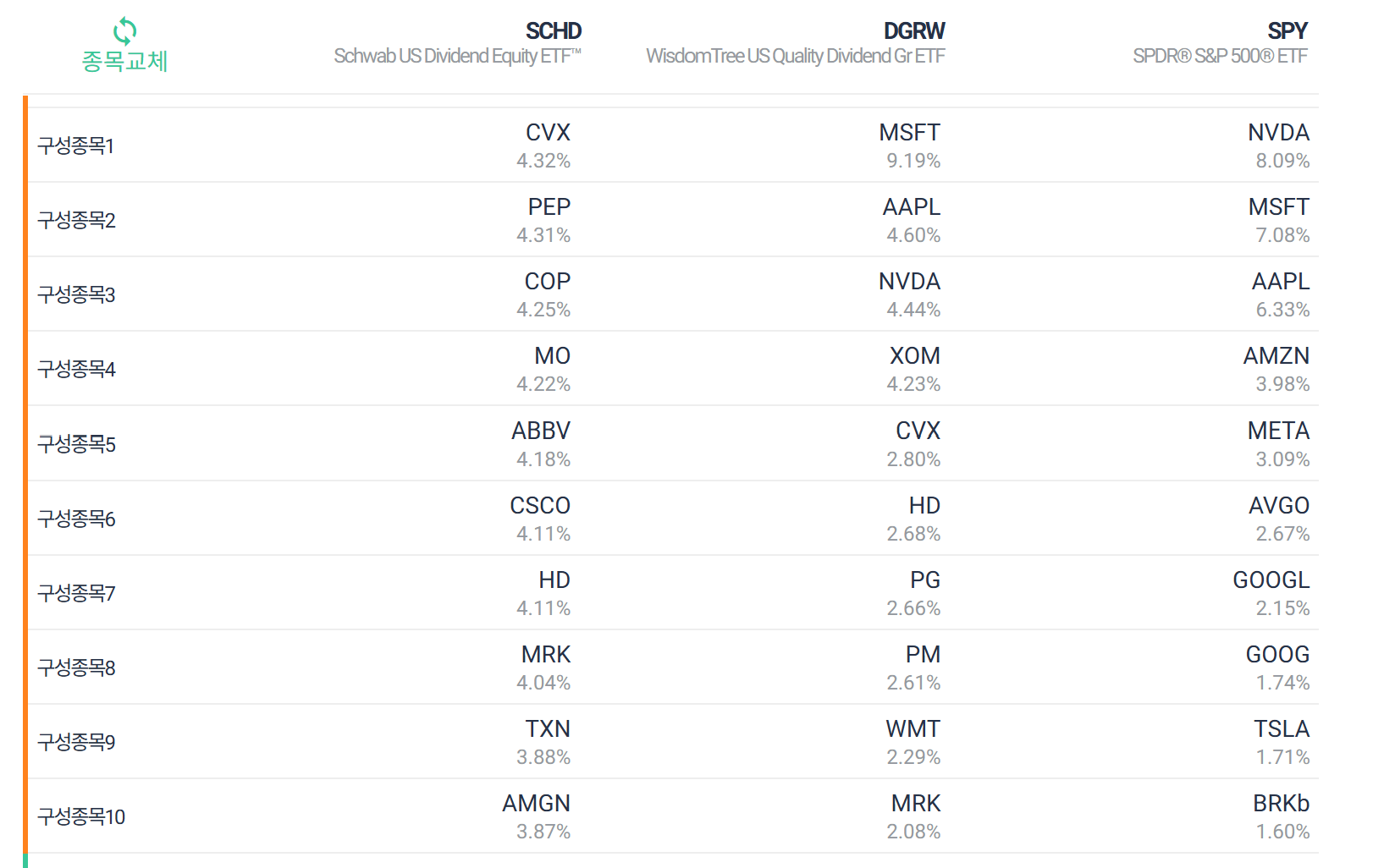 DGRW와 SPY의 상위 3종목은 상당히 재밌네요.